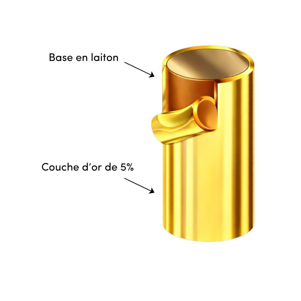 Contrairement au plaqué or, la couche d’or représente environ 5 % du poids total, garantissant une tenue longue durée et une excellente résistance à l’usure.
